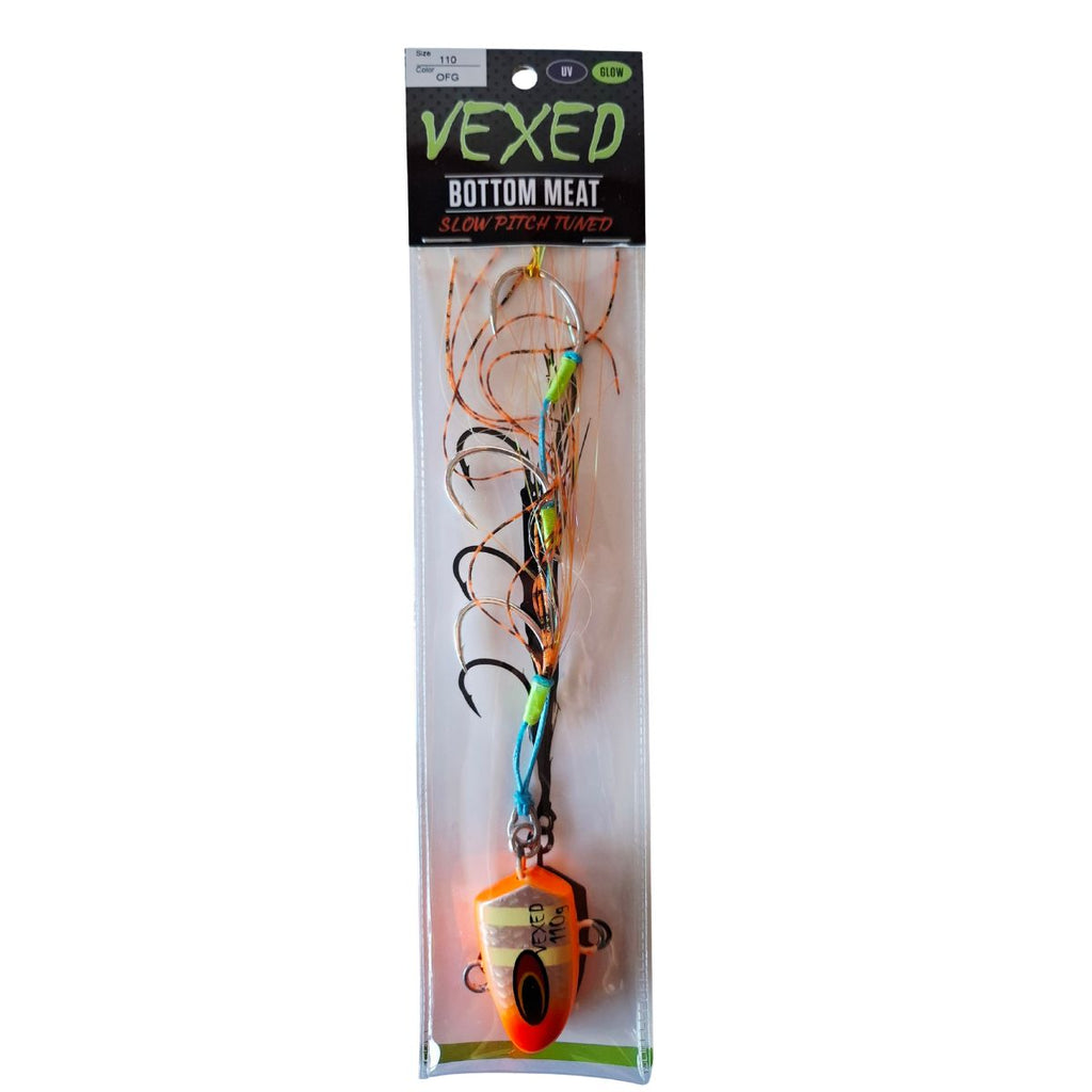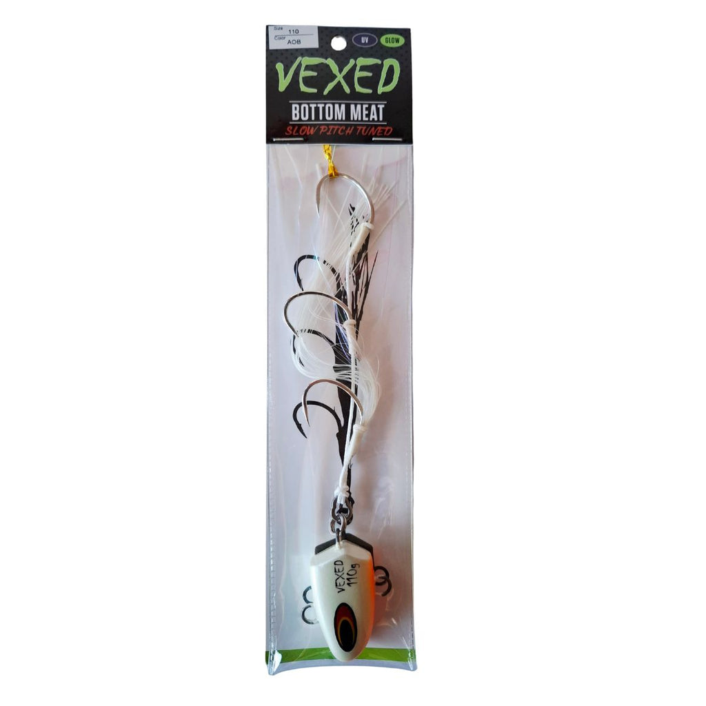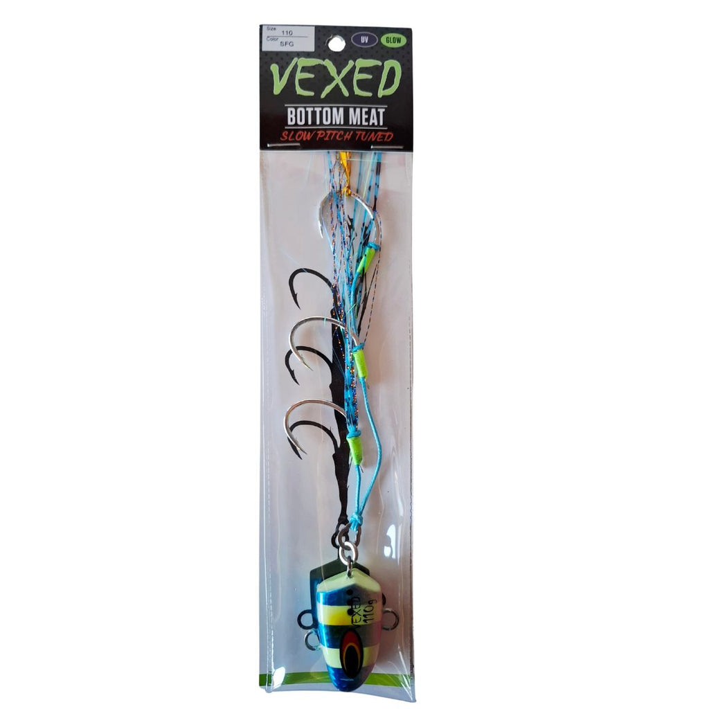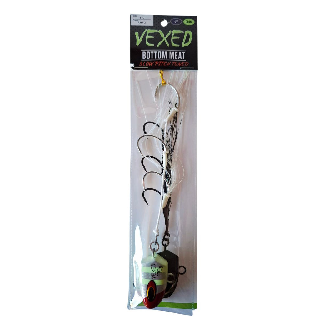 The Vexed Bottom Meat Slow Pitch Tuned is engineered specifically for slow pitch jigging with PE2-5 line. Featuring a refined BKK slow pitch pike-shaped hook design, this jig sets more reliably with slow pitch outfits where traditional heavier gauges can be difficult to drive home. The finer hook geometry reduces resistance during the set, translating to better hook-ups and more landed fish. Ideal for anglers targeting bottom structure with precision slow pitch techniques.